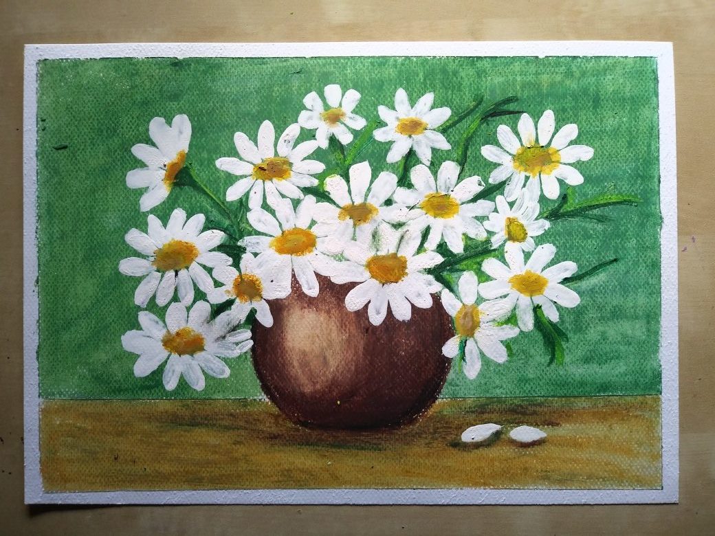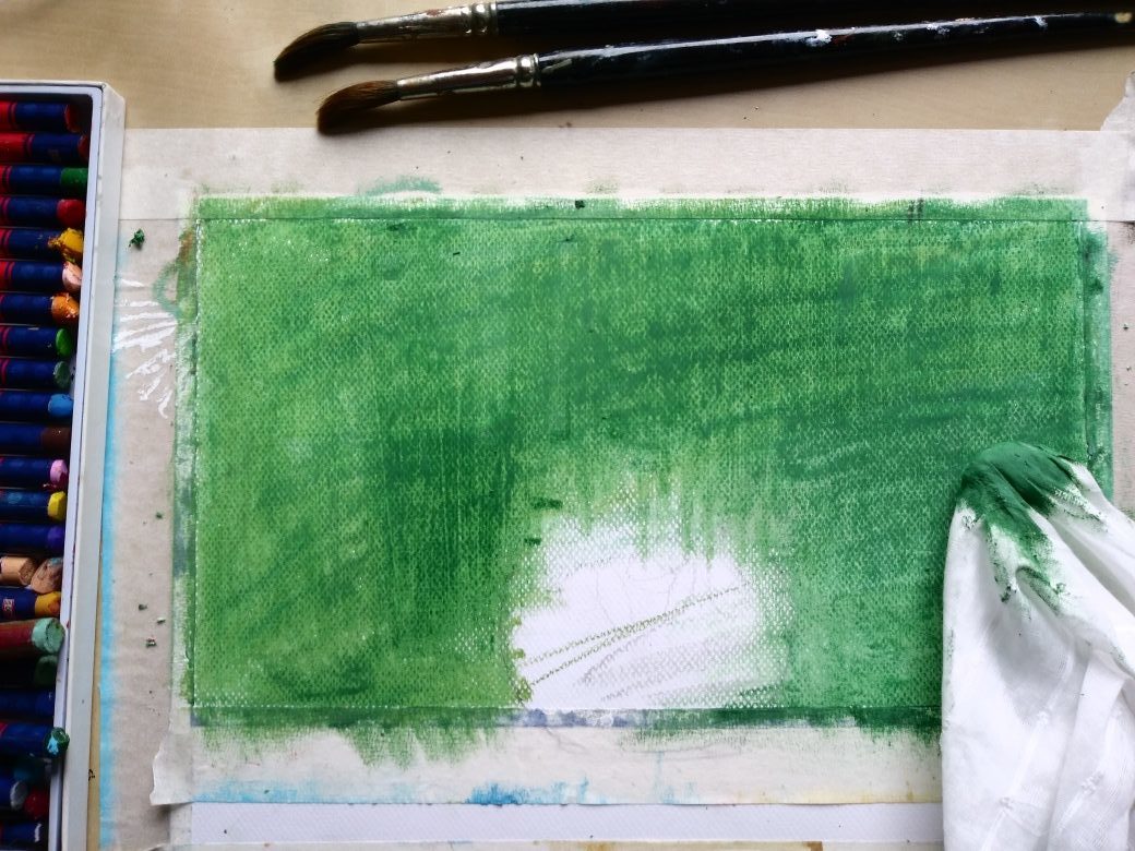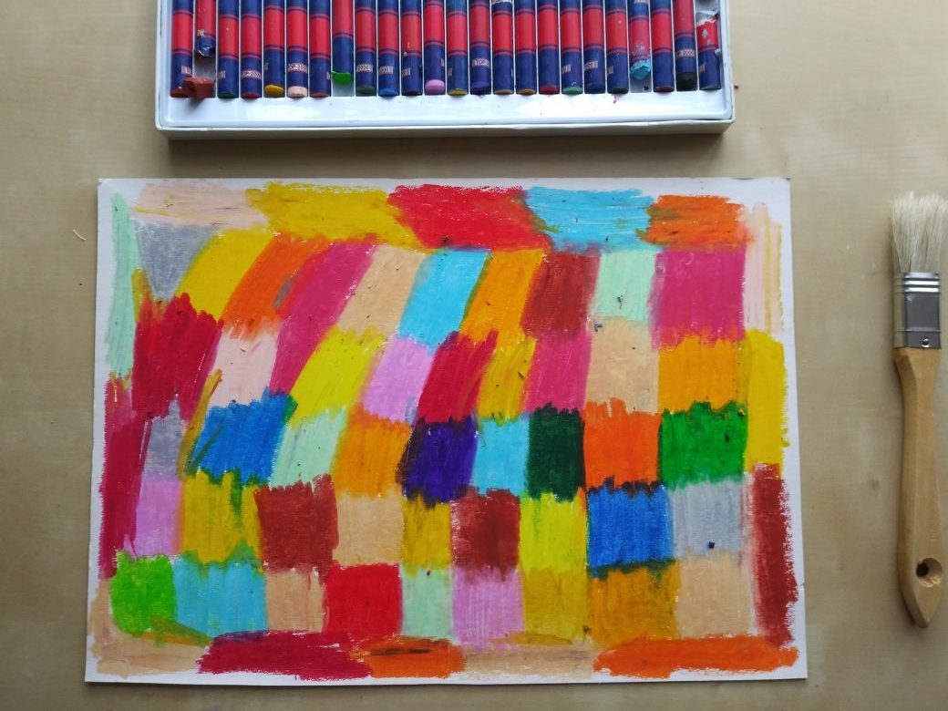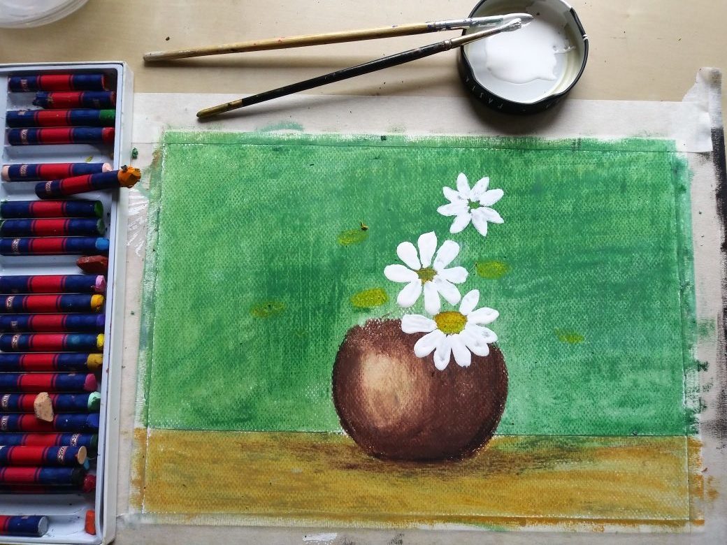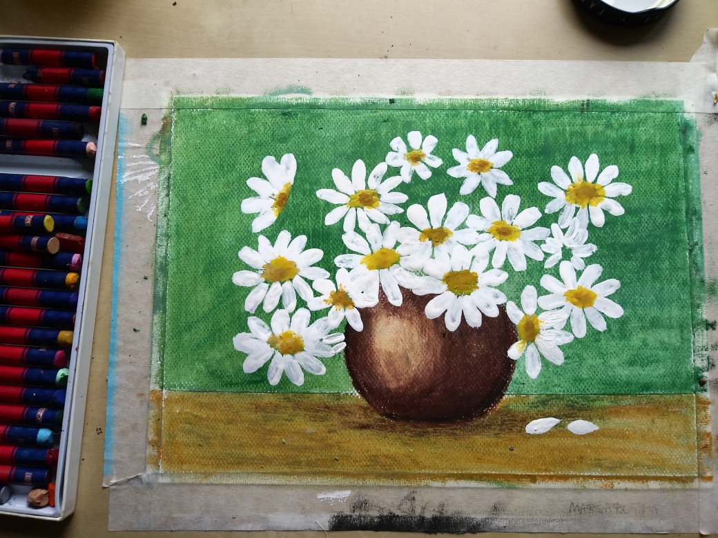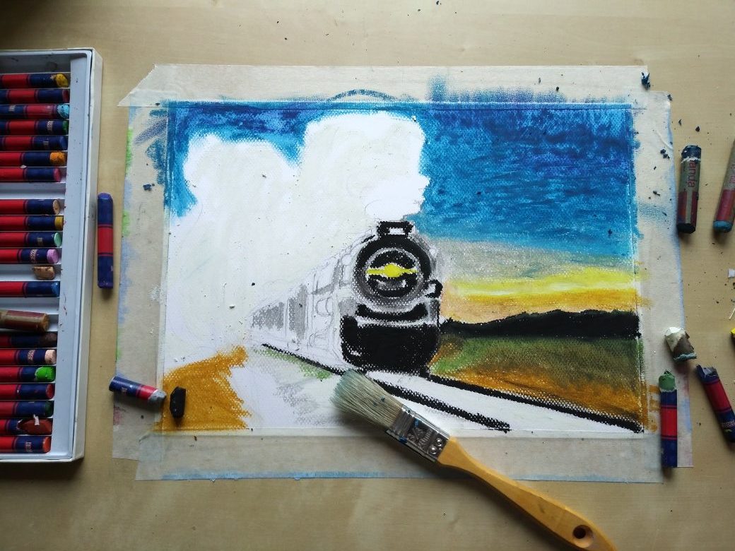 Łączenie pasteli olejnych z farbami akrylowymi jest możliwy bo obydwie techniki nie są transparentne. Warto eksperymentować w pracy twórczej, w ten sposób uczymy się i doświadczamy nowych wyzwań.
