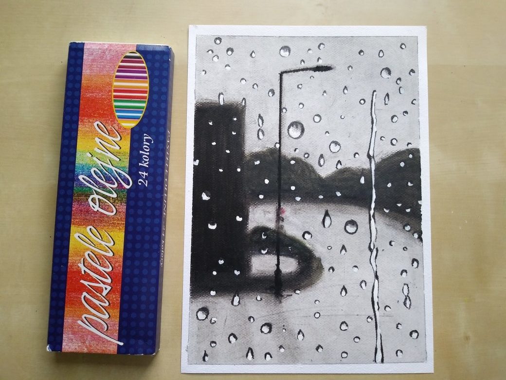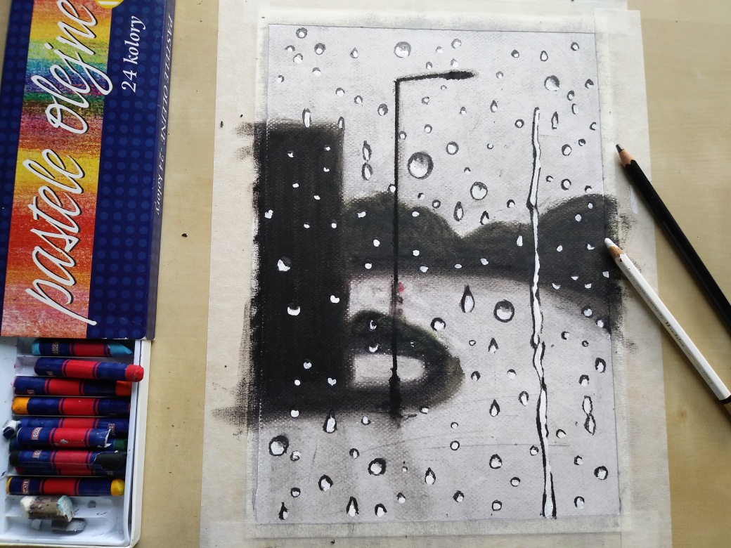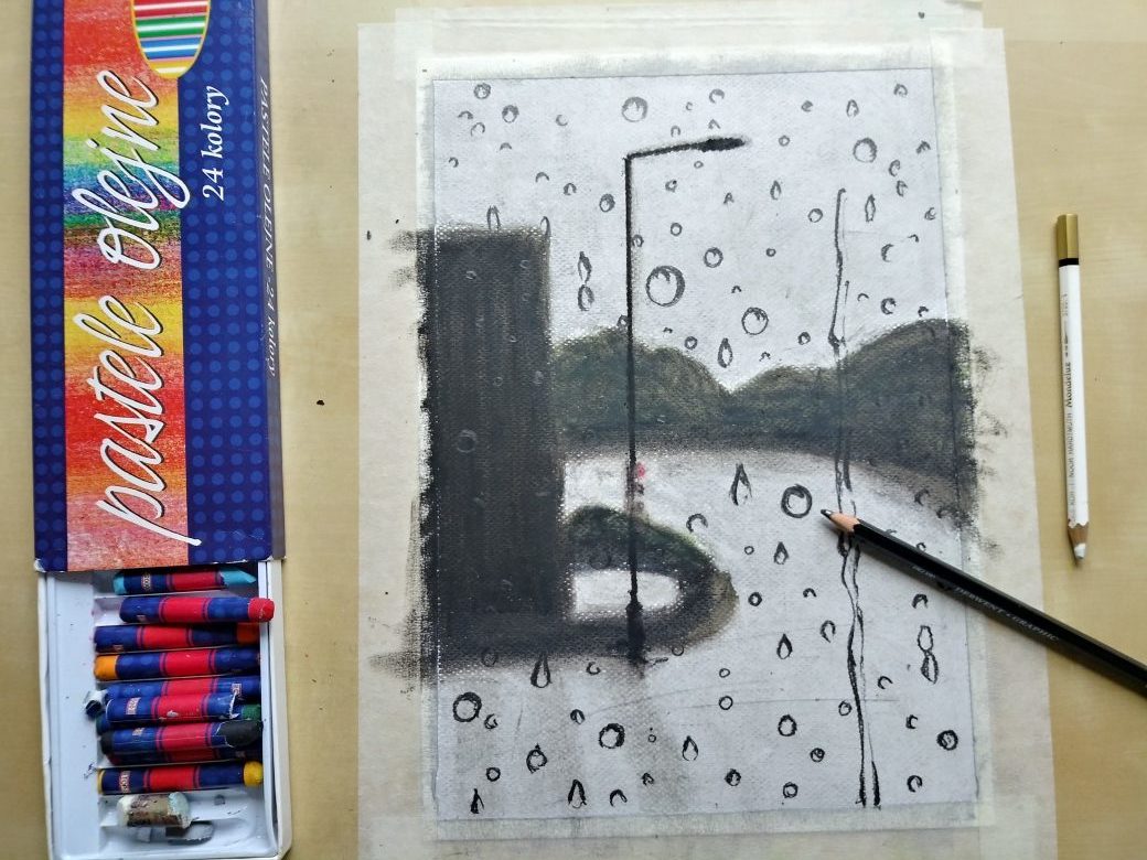 Zimni ogrodnicy, św. Pankracy (12 maja), św. Serwacy (13 maja) i św. Bonifacy (14 maja) zamienili słoneczne dni na chłodne i deszczowe. Będąc w domu patrzymy na świat zza okien zalanych deszczem. Używając pasteli olejnych spróbuj narysować ten widok. Pomogą w tym kolory stonowane, szary i czarny. Do narysowania kropel użyj kredek lub miękkiego ołówka 8B i korektora.