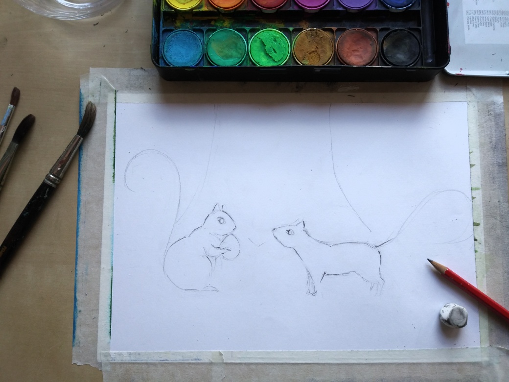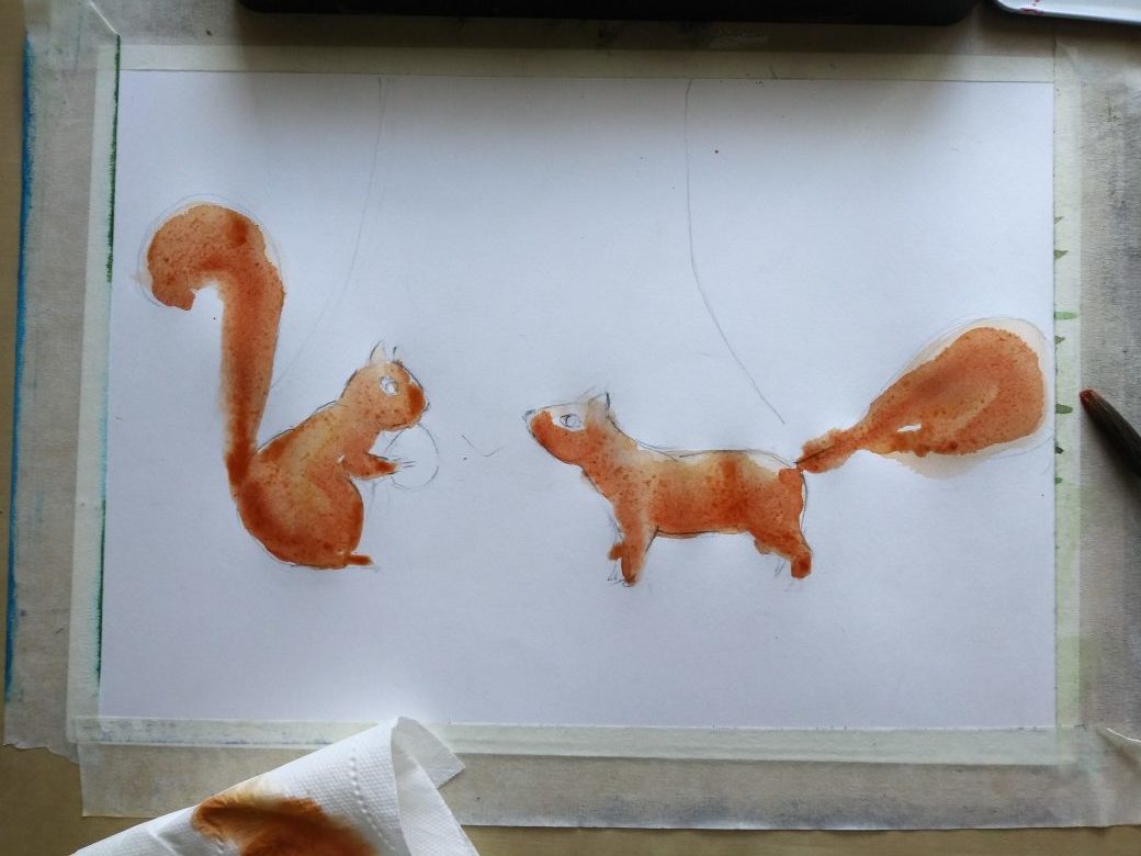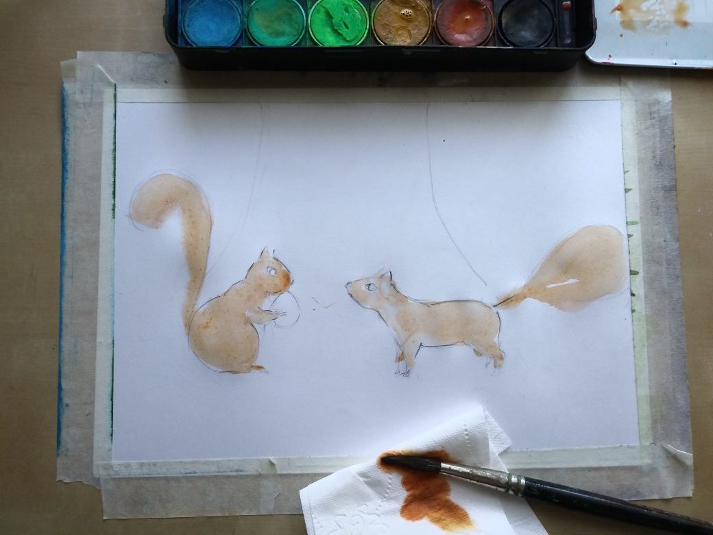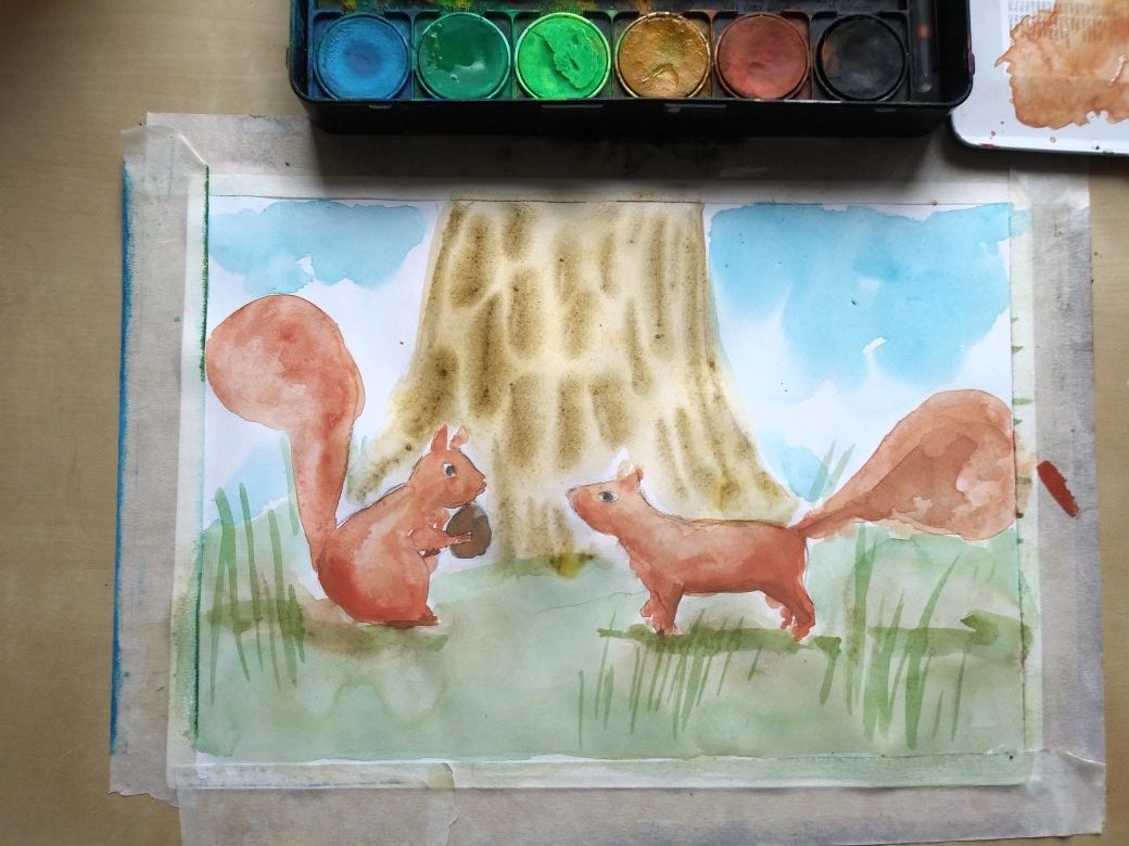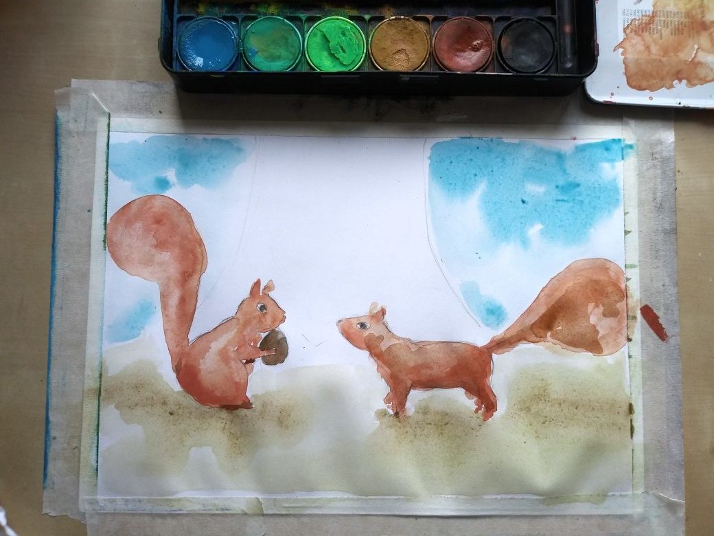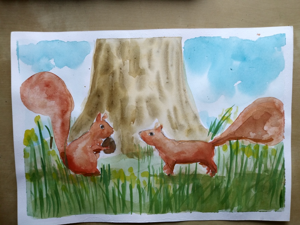 Dzisiaj namalujemy wiewiórki farbami akwarelowymi. Zwierzęta naszkicuj ołówkiem, korzystając ze zdjęć. Farby nakładaj miękkim pędzlem warstwami, a papier przyklej taśmą malarską by w czasie pracy się nie marszczył. Jeśli chcesz domalować szczegóły, pamiętaj by poprzednia warstwa farby była sucha. Powodzenia.