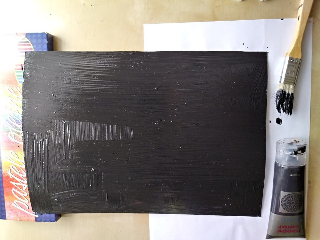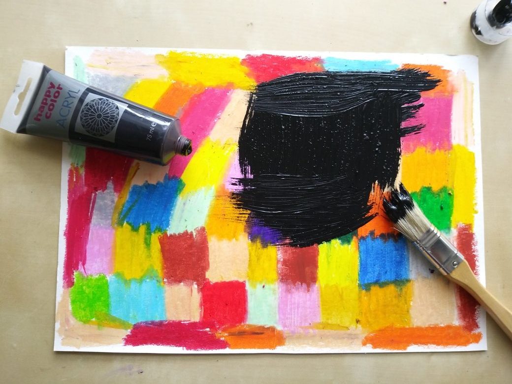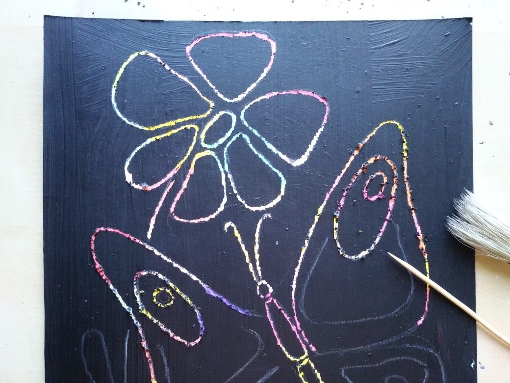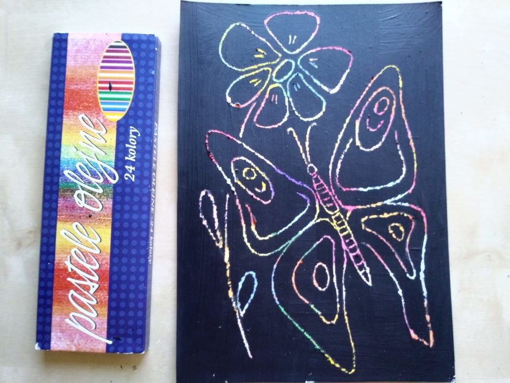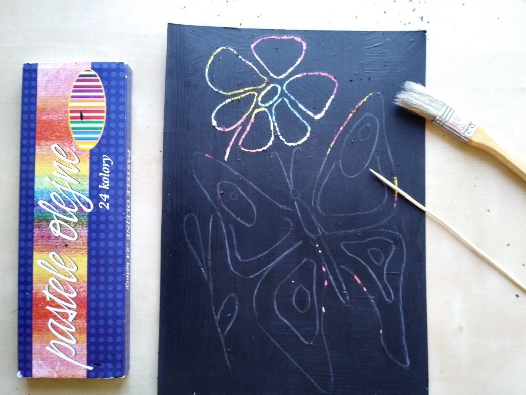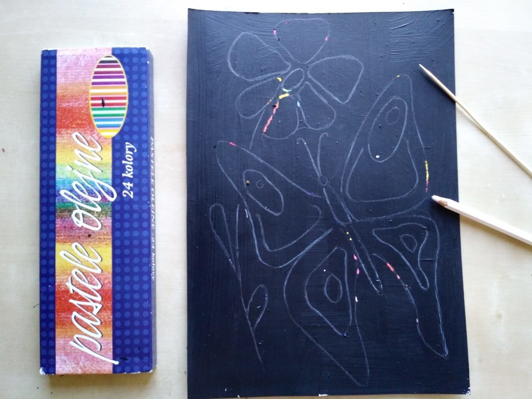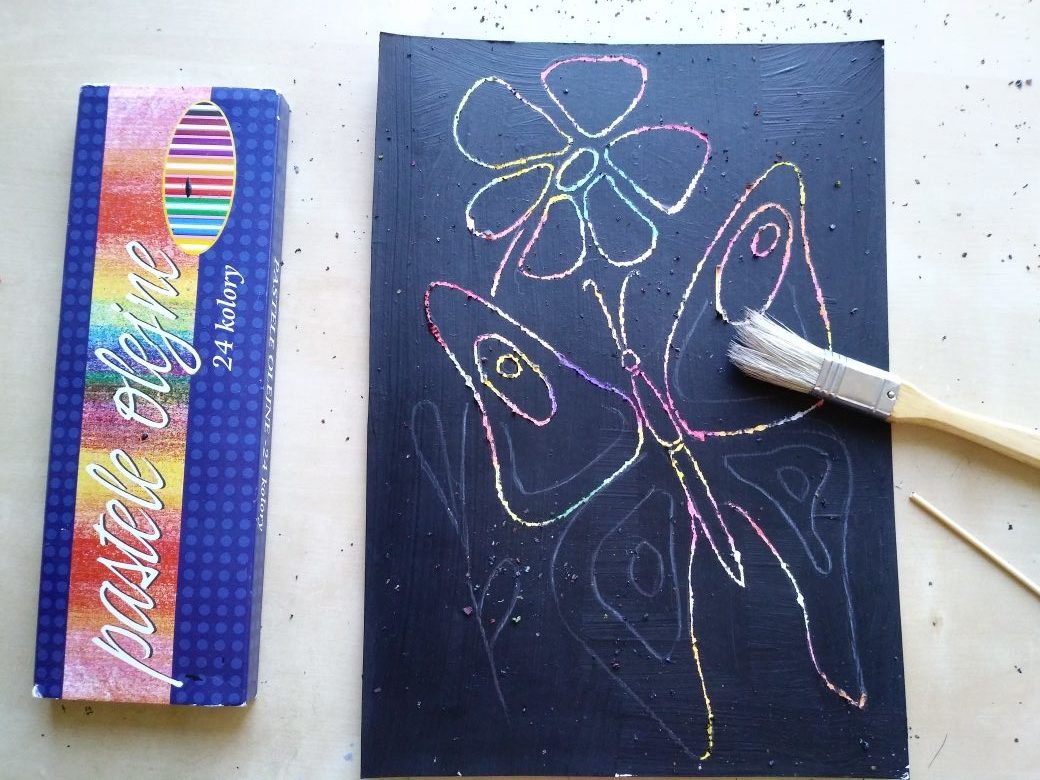 By móc wydrapać rysunek musi być odpowiedni podkład. W tym celu kartkę papieru o wysokiej gramaturze (karton) zarysowujemy pastelami olejnymi w kolorowe kwadraty. Tak przygotowaną kartkę zamalowujemy farbą akrylową czarną lub w innym ciemnym kolorze. Po wyschnięciu farby naszkicuj ołówkiem lub białą kredką motyla. Teraz można delikatnie, patyczkiem wydrapywać rysunek. Zdrapaną farbę akrylową z kartki usuwaj szerokim pędzlem.