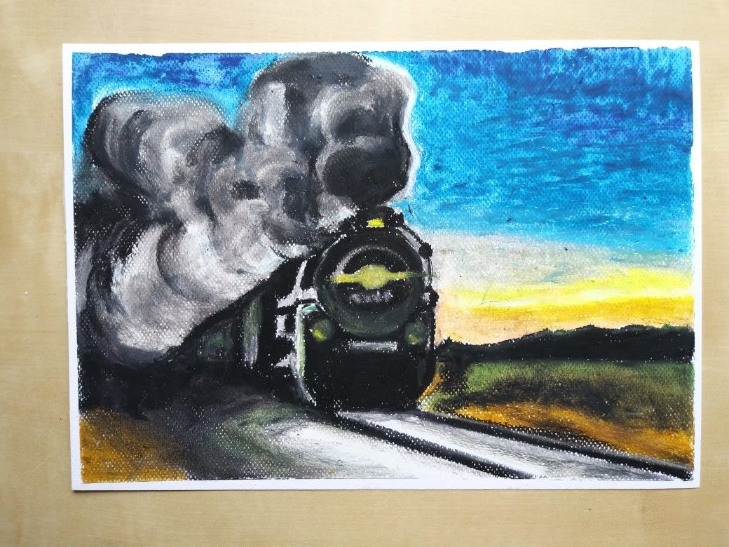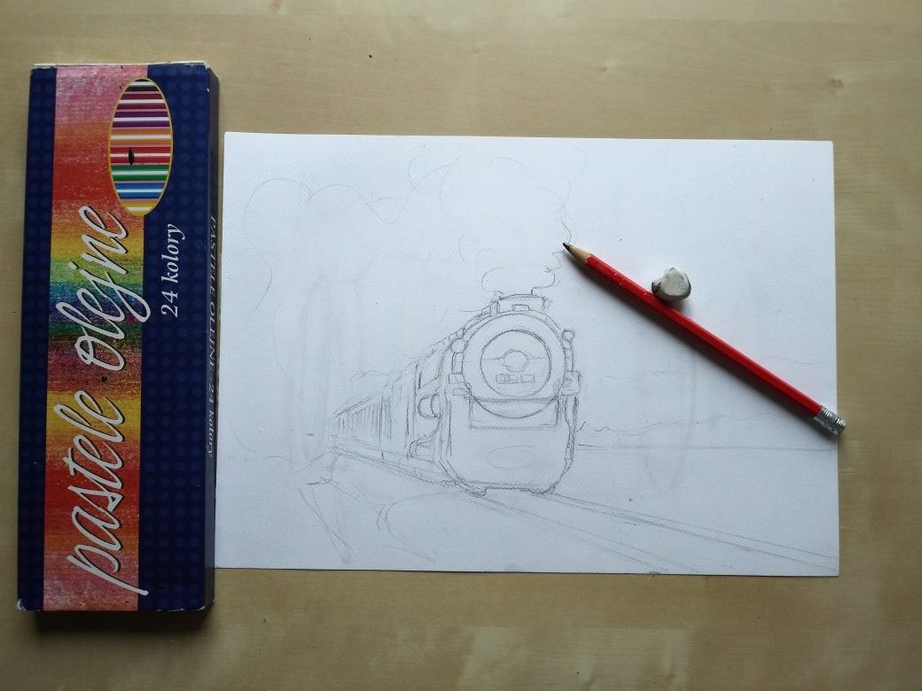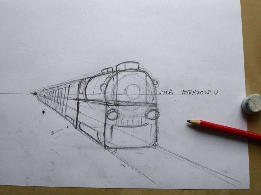 Zastosowanie w rysunku perspektywy zbieżnej pomoże uzyskać złudzenie optyczne, głębię w obrazie. W naszej pracy zastosujemy jeden punkt zbiegu na linii horyzontu, pociąg świetnie się do tego nada. Patrząc na poniższe rysunki, wykonaj krok po kroku pejzaż z pędzącą lokomotywą.