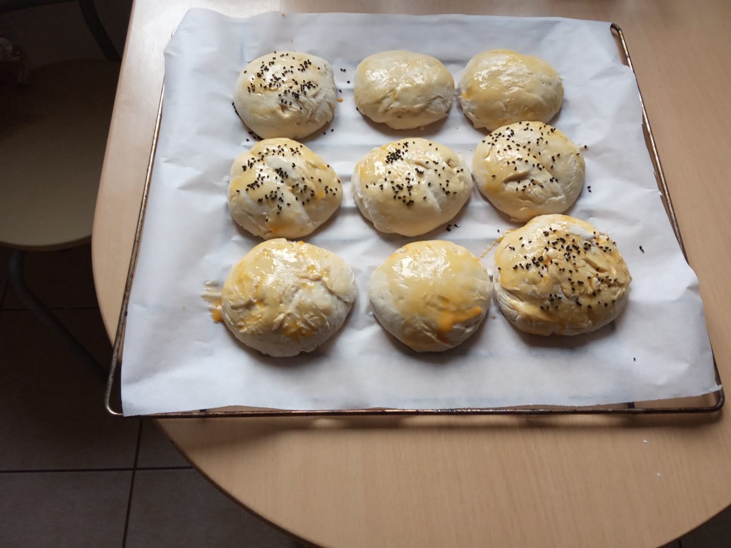 4. Bułeczki nam podrosły wiec za pomocą pędzelka smarujemy ich górę żółtkiem, możemy posypać makiem, pestkami dyni lub czarnuszką. Wstawiamy do nagrzanego piekarnika na ok.20-25 min.