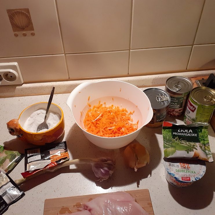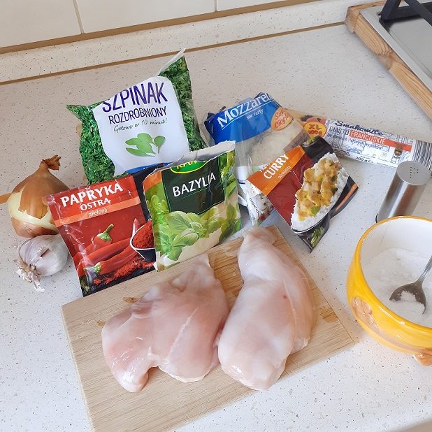 Produkty: piersi z kurczaka, warzywa jakie lubisz, śmietanę lub jogurt, ryż lub kaszę, przyprawy (sól, pieprz, papryka, carry)