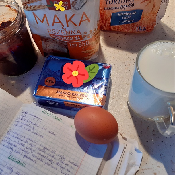 Produkty: 1 szklanka mleka, 1 kostka masła/margaryny, 1 jajko, szczypta soli, mąki ile ciasto zabierze