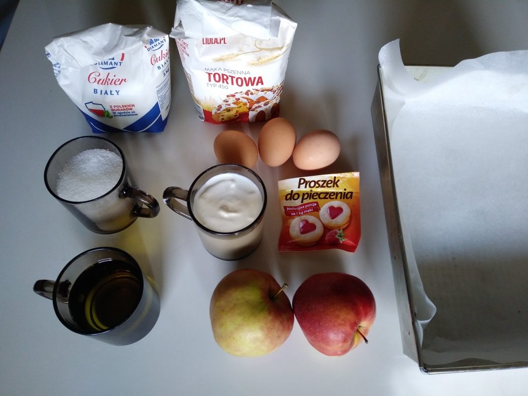 Produkty: 1 szklanka jogurtu ( może być maślanka), 1 szklanka cukru, 2 szklanki mąki, 3 jajka, 1/2 szklanki oleju, 3 płaskie łyżeczki proszku do pieczenia. Owoce (mogą być jabłka, rabarbar, śliwki, wiśnie itp.)
