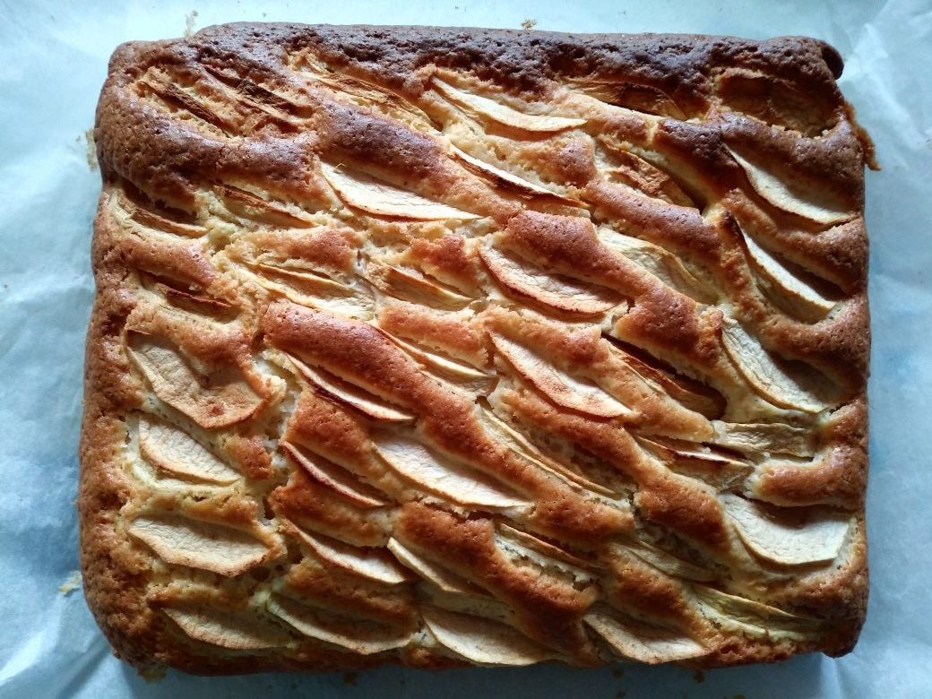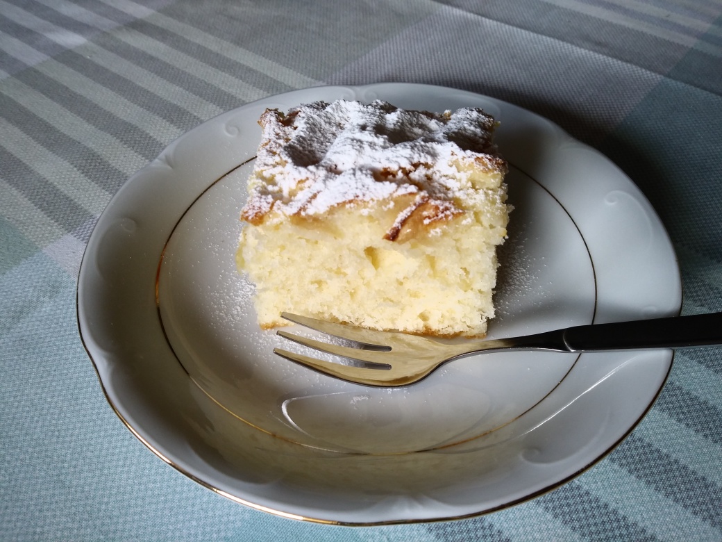 - Po wyjęciu placka z piekarnika i ostygnięciu posypujemy wypiek cukrem pudrem. Smacznego!
