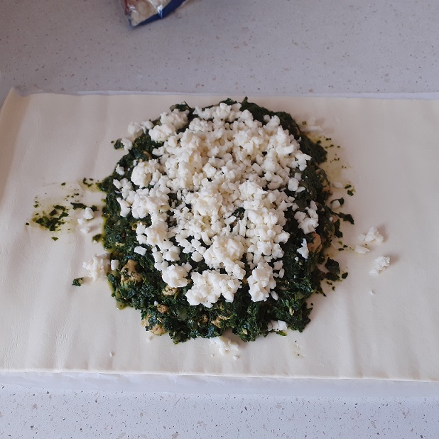 - Na ciasto francuskie przekładamy szpinak z kurczakiem i dodajemy mozzarelle