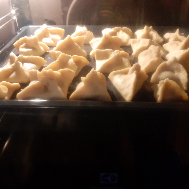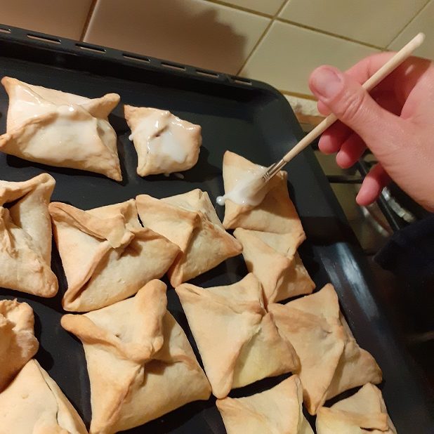 3. Rozwałkowujemy i kroimy w kwadraty, na które nakładamy powidła. Składamy przeciwległe rogi ciasta do siebie.
