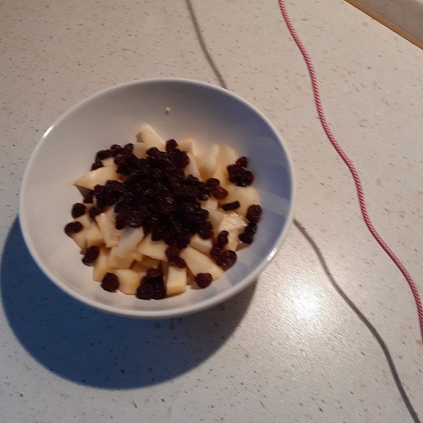 Produkty: kasza jaglana, mleko, suszone owoce. Gotujemy kaszę jaglaną na mleku bądź na wodzie. Do miseczki wrzucamy garść rodzynek zamiast cukru, możemy je zastąpić innymi suszonymi owocami lub łyżeczką miodu. Ja dodałam gruszkę, która jest zdrowa, zawiera potas i fosfor a także witaminy z grupy B.